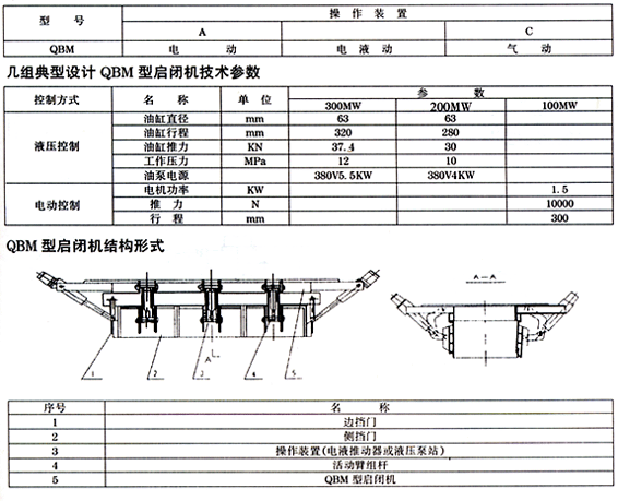 QBM型啟閉機(jī)安置在鍋爐渣井下部,在撈渣機(jī)正常工作時(shí),作爐底密封。在撈渣機(jī)旁出現(xiàn)保障,需檢修時(shí),關(guān)閉此門,作臨時(shí)儲(chǔ)渣及爐堂密封。 QBM型啟閉機(jī)由若干個(gè)部分組成。其安裝尺寸根據(jù)工況需求確定,關(guān)斷門與渣井之間采用螺栓連接,下部直接插入撈渣機(jī)水槽中。 QBM型啟閉機(jī)的操作控制有電液動(dòng)、電動(dòng)、氣動(dòng)方式。選用何種方式,定貨時(shí)請(qǐng)注明。